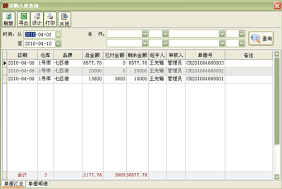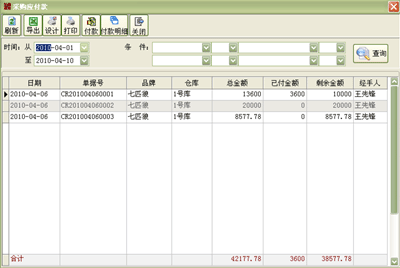 ·可以将所选时间段内应付款的单据全部显示出来,在通过付款(付款按钮)打开付款窗体进行付款,付款时根据品牌来付款,是从前往后来冲减的;销售应收款与采购应付款类似 |