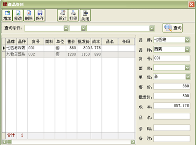 《商融服装进销存》是一套完整的集进、销、存、会员管理为一体的商业管理软件,它操作简单,界面友好,在保持软件操作尽可能简单直观的同时,又拥有相对比较完整的功能,能满足大多数小型服装经销企业,包括专卖店、个体经营者、小型服装超市等环境下应用;适用于服装、鞋帽等商品的管理;具体功能如下: