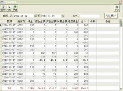·以天为单位,显示每天的收取押金、消费金额、退还押金、实收金额等情况