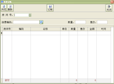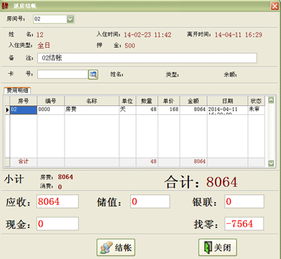 ·退房时选择房间号,即可显示该房间旅客的入住时间以及在入住期间的消费情况