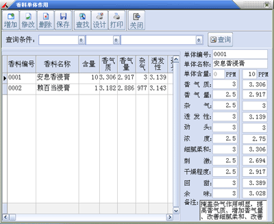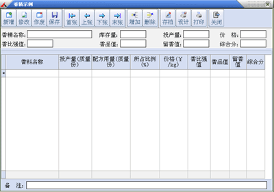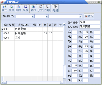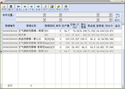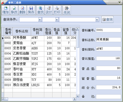 ·显示所有的香精示例,可以根据三值和综合分来查询,以及调配一种新的香精 |