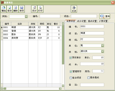 ·设置顾客消费的收费明细项目;如果有促销活动时,可以设置组合项目;需要管理的库存的明细需选种管理库存复选框;设置项目的提成信息、以及计时项目的收费规则