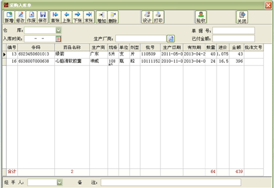 ·采购回来的药品必须在此进行验收入库;单据验收入库后不能修改,如果进价输入错误(需在进价调价单里调整),数量输入错误(可以通过出库单来减去多验收的数量)